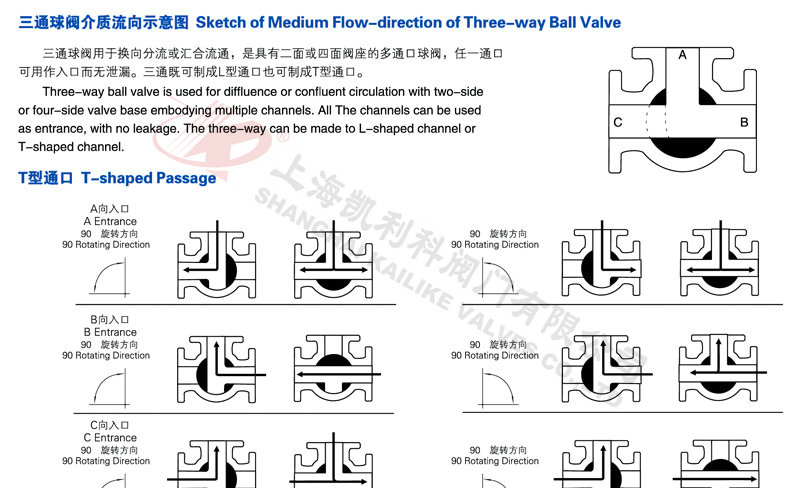 氣動三通球閥分L型和T型,介質流通方向見下圖。L型氣動三通球閥適用于介質流向的切換,能使相互垂直的兩個通道連通:T型氣動三通球閥適用于介質的分流、合流或流向 切換,T型孔道可以使三個通道互相連通或使其中兩個通道連通,氣動三通球閥一般采用三個閥座結構,亦可根據用戶要求采用四閥座結構。