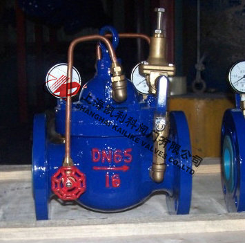900X消防緊急關(guān)閉閥當(dāng)出口壓力低于導(dǎo)閥設(shè)定的壓力時,導(dǎo)閥此時處于開通狀態(tài),主閥上腔壓力與主閥出口壓力相等,進口與吃口存在壓差,水流經(jīng)閥口出口流出,當(dāng)消防泵氣泵時,或變平泵壓力升高時,超過導(dǎo)閥設(shè)定壓力,由主閥進口向?qū)чy管控制室壓力升高,作用在彈簧壓力增大,向下壓緊,帶動閥芯下移,使導(dǎo)閥關(guān)閉,此時主閥進口壓力通過節(jié)流閥補充到主閥閥蓋上腔,因閥瓣受到向下壓力大于向上推力,主閥關(guān)閉。值得注意的是,進口壓力小于設(shè)定壓力是,主閥處于開啟狀態(tài),進口壓力大于設(shè)定壓力,閥瓣關(guān)閉。