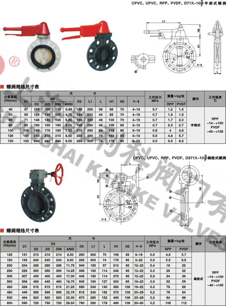 聲明:【D71X-10S塑料蝶閥】規格型號、結構尺寸由上海凱利科閥門有限公司提供,如何選擇適用的D71X-10S塑料蝶閥產品,使之在工藝控制中安全可靠、經濟適用,可致電我司銷售部門及技術部門,我們將在最短的時間內為您解答!